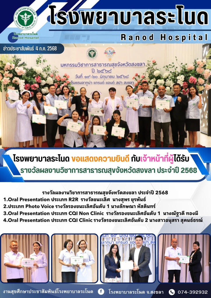 4 ก.ค.68 โรงพยาบาลระโนด ขอแสดงความยินดีกับเจ้าหน้าที่ผู้ได้รับรางวัลผลงานวิชาการสาธารณสุข จังหวัดสงขลา ประจำปี 2568