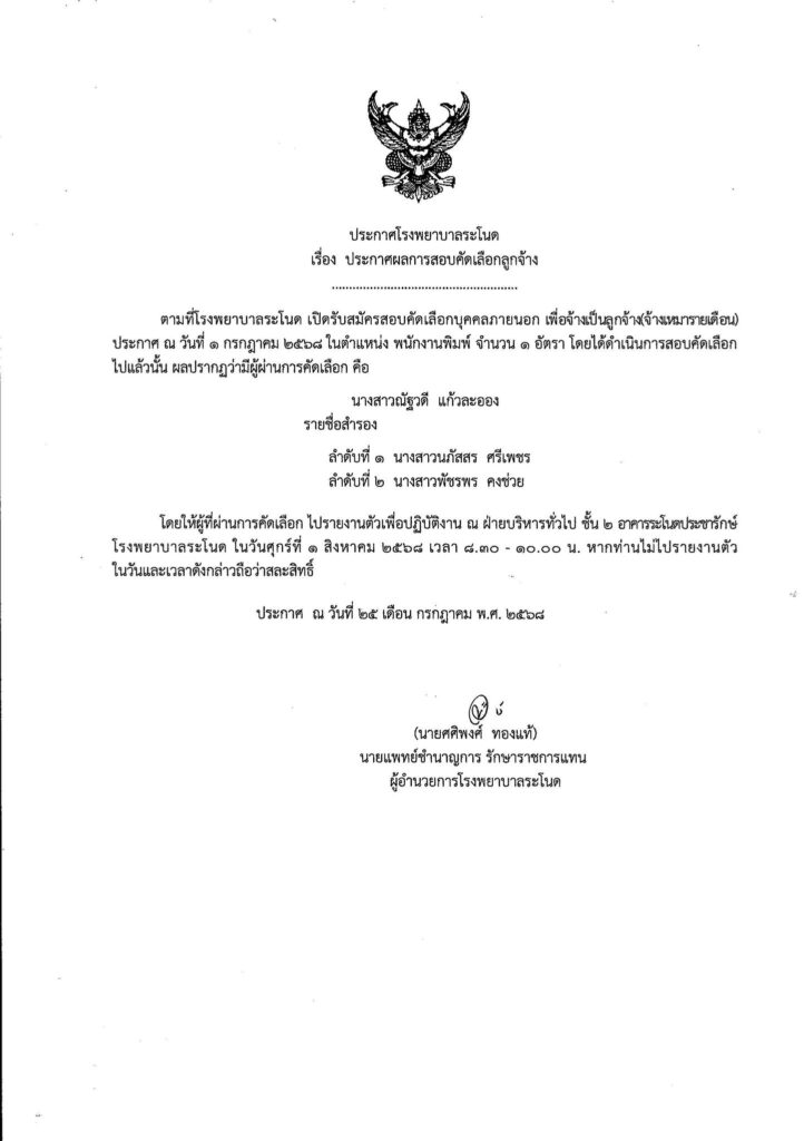 25 ก.ค.68 ประกาศโรงพยาบาลระโนด ประกาศผลการสอบคัดเลือกลูกจ้าง ตำแหน่ง พนักงานพิมพ์ จำนวน 1 อัตรา