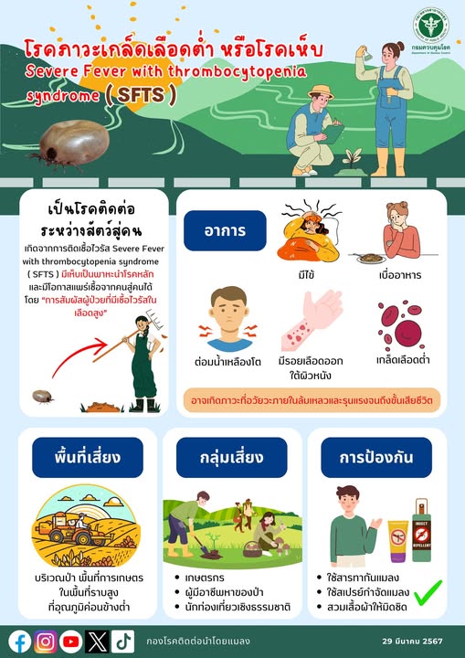 19 ส.ค.68 ขอความร่วมมือเฝ้าระวังโรคติดเชื้อไวรัสที่ทำให้เกิดอาการไข้สูงและเกร็ดเลือดต่ำ severe fever with thrombocytopenia syndrome (SFTS) ซึ่งเป็นโรคอุบัติใหม่ที่ผู้ป่วยมักมีอาการ ไข้สูง อาเจียน ท้องเสีย เกร็ดเลือดต่ำ ตับอักเสบ และอาจเกิดภาวะช็อกหรืออวัยวะล้มเหลวได้ พบมีการแพร่เชื้อจากเห็บที่เป็นพาหะรวมถึงอาจจะติดต่อจากสัตว์สู่คน หรือคนสู่คน ผ่านสารคัดหลั่งของผู้ป่วย หากมีอาการดังกล่าวควรพบแพทย์ทันที