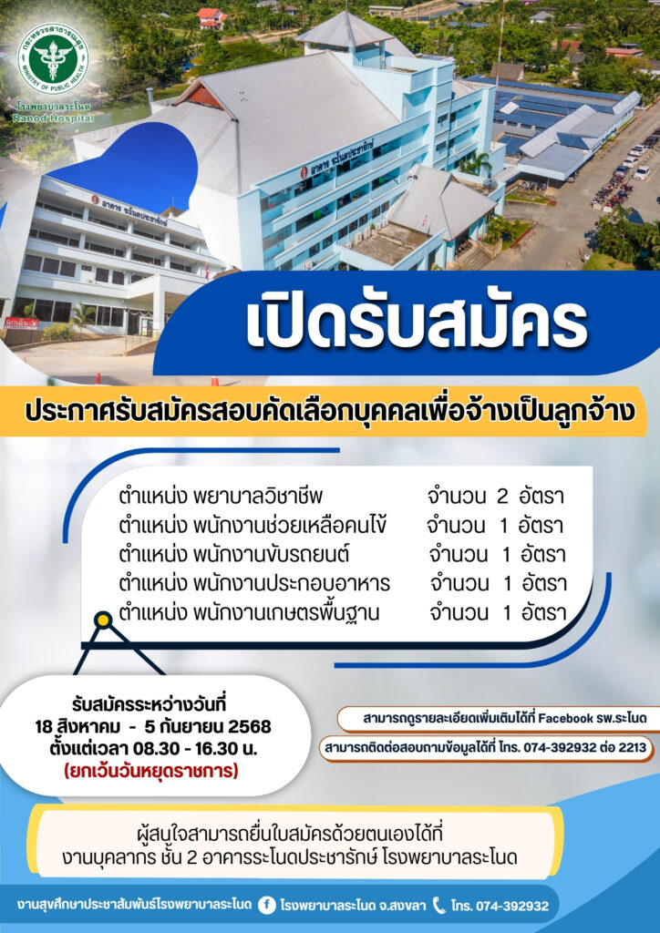 26 ส.ค.68 ประกาศรับสมัครสอบคัดเลือกบุคคลเพื่อจ้างเป็นลูกจ้าง สามารถดาวน์โหลดข้อมูลเพิ่มเติมได้ที่ https://ranodhospital.moph.go.th/webhis/?p=1325