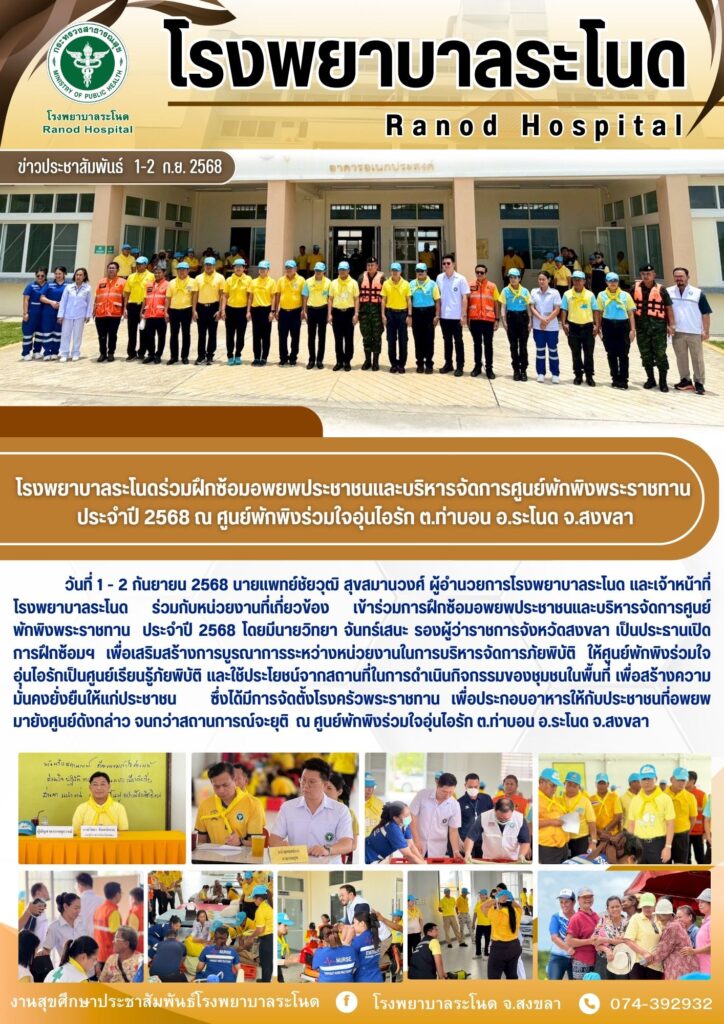 2 ก.ย.68 โรงพยาบาลระโนดร่วมฝึกซ้อมอพยพประชาชนและบริหารจัดการศูนย์พักพิงพระราชทาน ประจำปี 2568