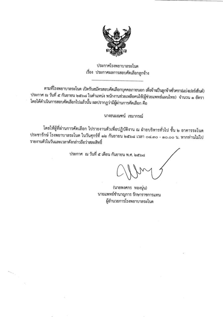 5 ก.ย.68 ประกาศโรงพยาบาลระโนดเรื่อง ประกาศผลการสอบคัดเลือกลูกจ้าง ตำแหน่ง พนักงานช่วยเหลือคนไข้ (ผู้ช่วยแพทย์แผนไทย)