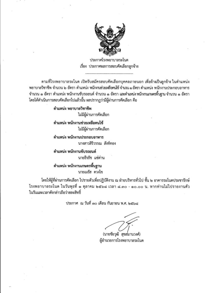 6 ต.ค.68 ประกาศโรงพยาบาลระโนด เรื่อง ประกาศผลการสอบคัดเลือกลูกจ้าง ตำแหน่ง พยาบาลวิชาชีพ ตำแหน่ง พนักงานช่วยเหลือคนไข้ ตำแหน่ง พนักงานประกอบอาหาร ตำแหน่ง พนักงานขับรถยนต์ ตำแหน่ง พนักงานเกษตรพื้นฐาน