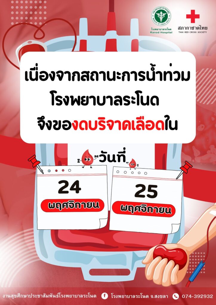 25 พ.ย.68 เนื่องจากสถานะการน้ำท่วม โรงพยาบาลระโนด ขจึงของดบริจาคเลือด ใน วันที่ 24-25 พ.ย.68