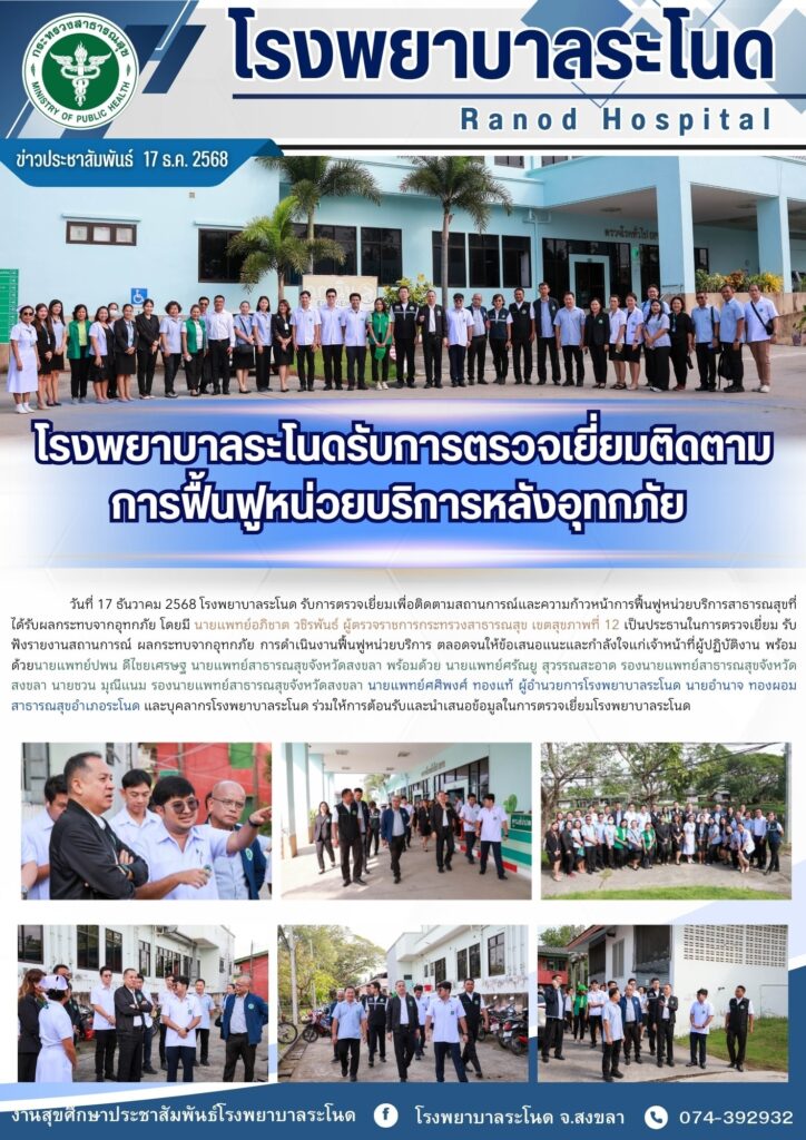 17 ธ.ค.68 โรงพยาบาลระโนด รับการตรวจเยี่ยมเพื่อติดตามสถานการณ์และความก้าวหน้าการฟื้นฟูหน่วยบริการสาธารณสุขที่ได้รับผลกระทบจากอุทกภัย