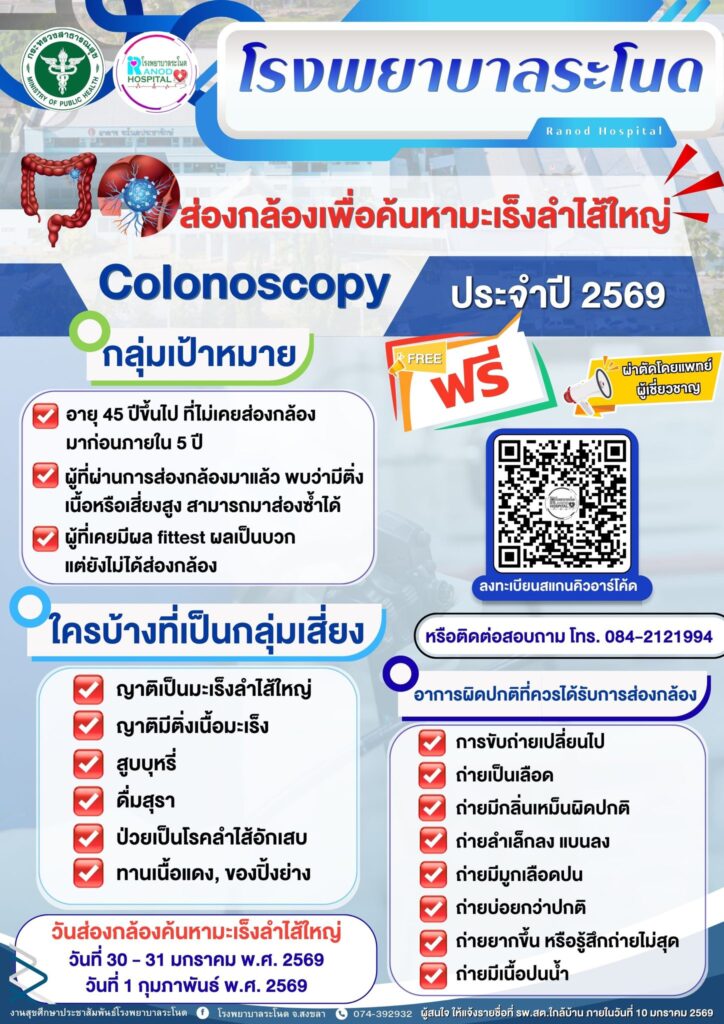 โรงพยาบาลระโนด ให้บริการส่องกล้องเพื่อค้นหามะเร็งลำไส้ใหญ่ วันที่ 30,31 มกราคม 2569 และ 1 กุมภาพันธ์ 2569