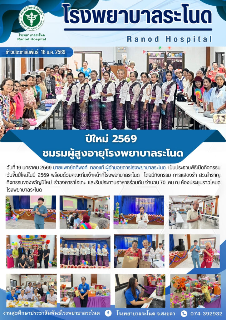 16 ม.ค 2569 ชมรมผู้สูงอายุโรงพยาบาลระโนด จัดปีใหม่ 2569 นายแพทย์ศศิพงศ์ ทองแท้ ผู้อำนวยการโรงพยาบาลระโนด เป็นประธานพิธีเปิดกิจกรรมวันขึ้นปีใหม่ในปี 2569 พร้อมด้วยคณะทีมเจ้าหน้าที่โรงพยาบาลระโนด โดยมีกิจกรรม การแสดงรำ สว.สำราญ กิจกรรมของขวัญปีใหม่ รำวงคาราโอเกะ และรับประทานอาหารร่วมกัน จำนวน 70 คน ณ ห้องประชุมราวโหนด โรงพยาบาลระโนด